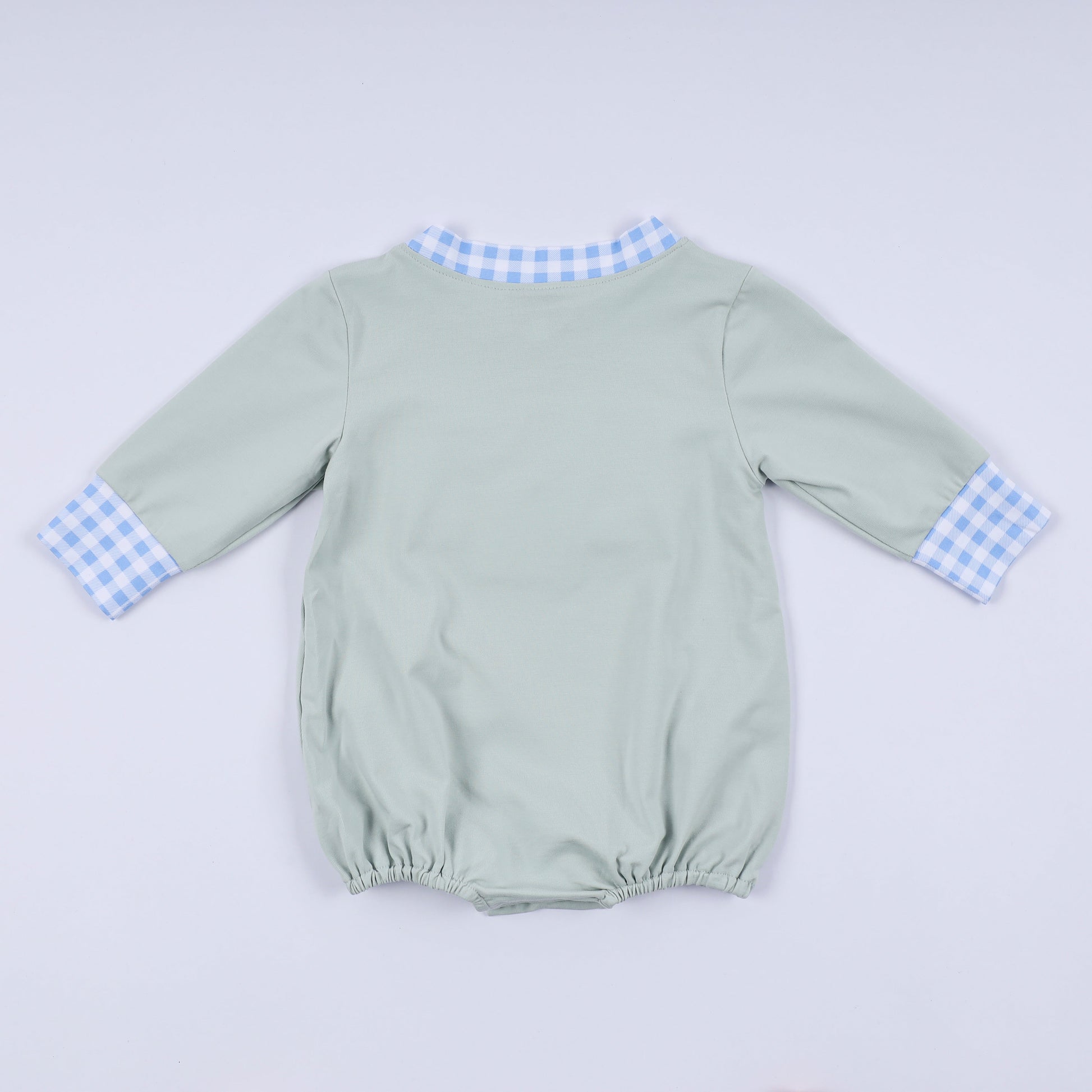 Adorable hand-smocked bubble featuring a charming cow design in soft sage tones. This whimsical piece combines traditional smocking techniques with a playful aesthetic, perfect for little ones who love farm-inspired fashion. The bubble silhouette offers comfortable movement and a timeless look that works for any occasion. Crafted with care and attention to detail, it's a delightful addition to any child's wardrobe.